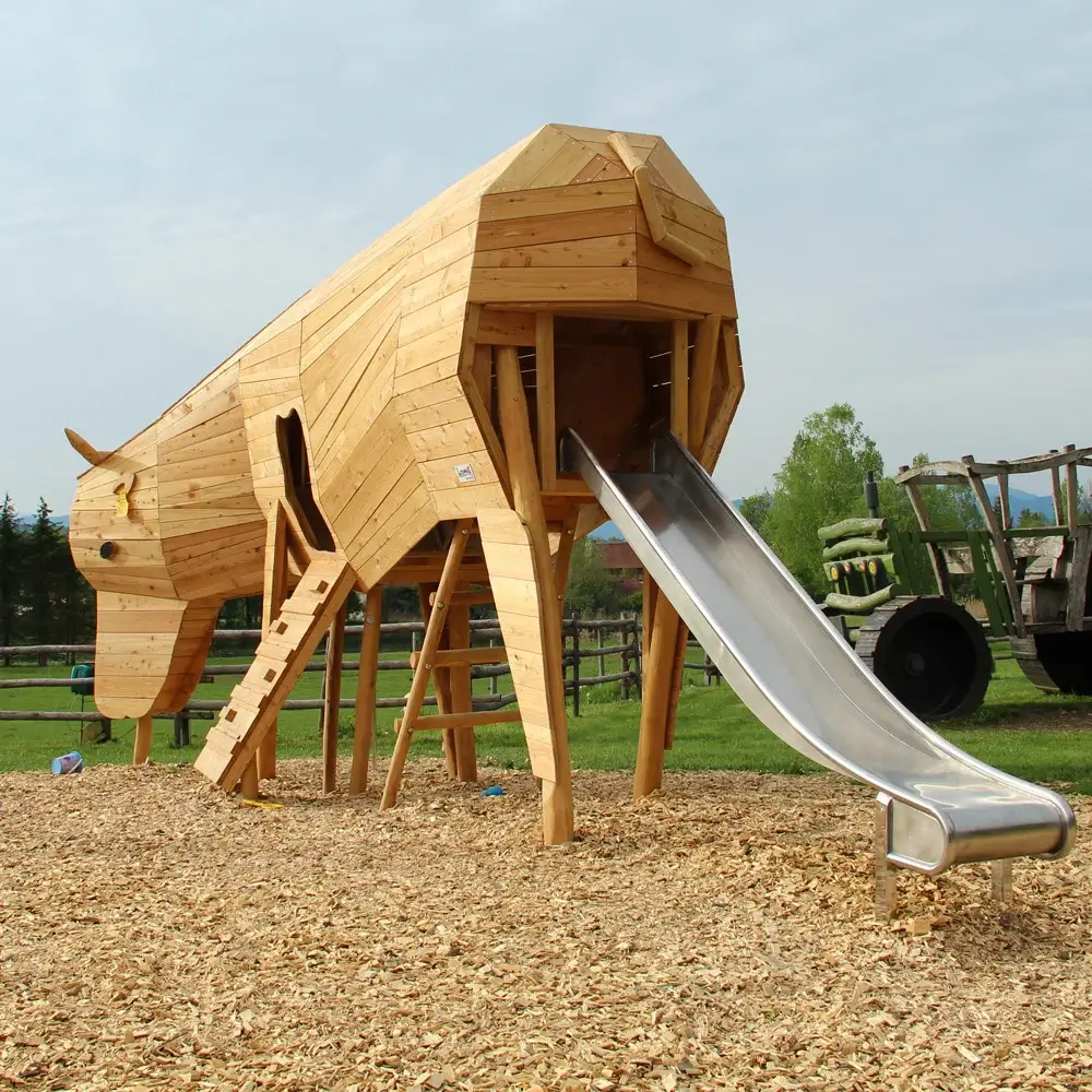 Die Spielskulptur in Form einer überdimensionalen Kuh wurde individuell nach den Wünschen des Kunden entworfen und realisiert. Sie besteht hauptsächlich aus natürlich belassenem Lärchenholz. Die tragenden Standpfosten wurden aus robuster Robinie gefertigt, was der Anlage sowohl Stabilität als auch eine naturnahe Optik verleiht.